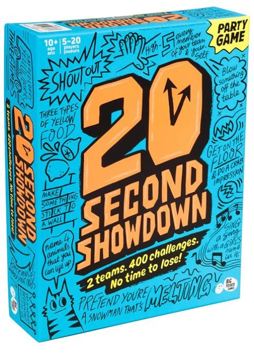 Choose a player to referee the contest in 20 Second Showdown. Everyone else splits into two teams and sits opposite each other, face-off style. At the beginning of each round, the referee resets the timer with an even amount o”sand” in each half. The referee’s job is to read out the challenges and flip the timer, which has twenty seconds of sand in each half. To win, you need to force the other team to run out of “sand” by completing your challenges as quickly as possible. The first team to run out of “sand” loses the round, and the first team to win three rounds is crowned “20-Second Champions”.