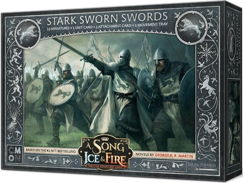 Some units can be judged on their military skills or strength, but in war, when another army is advancing, loyalty is a much more valuable asset. The sworn swords are the bedrock of the strategies of the Stark commanders. They are brave and capable to be sure, but their loyalty to the Direwolf banner can never be questioned. To a man, they would rather perish in battle, than leave one of their brothers behind. The A Song of Ice & Fire: Tabletop Miniatures Game ��� Stark Sworn Swords unit box contains twelve miniature sworn sword figures, one sworn sword unit attachment, a movement tray, and all associated unit cards. These warriors have waited in the frozen north too long, dreaming of battle. They may not be the best equipped units in the war, but they know that shiny armor and pretty swords alone do not make a so