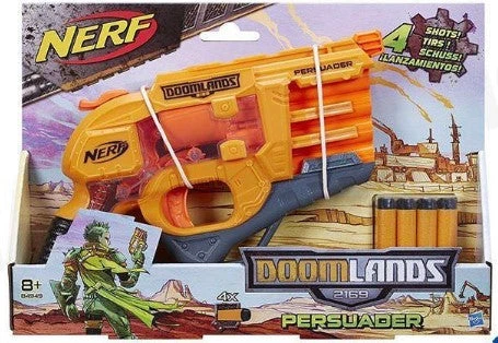 The Nerf Doomlands 2169 Persuader blaster fires 4 darts in a row without reloading. With a design that’s lean and intimidating, the Persuader blaster is the kind of sidearm that lone heroes can carry to keep themselves ready for any menace that may cross their path in the lawless landscape of Doomlands 2169. Load 4 darts into the front of the barrel, pull back the hammer, and pull the trigger to fire 1 dart. Another pull of the hammer and the trigger unleashes another dart. Outlaws, beware! The Nerf Doomlands 2169 Persuader blaster has a clear area that reveals the firing mechanism inside. Witness the mechanical action every time a dart is fired! Blaster-toting heroes experience not only the rush of firing the darts, but they also get to see the blaster’s firing mechanism discharge a dart from the barrel. With its hammer-action and 4-shot blasting, the Persuader is a blaster that lone heroes everywhere can take along on all their adventures into the crime-ridden wasteland of Doomlands 2169