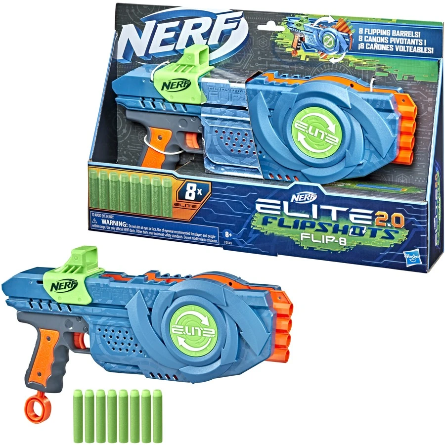 - flip into battle: nerf elite 2.0 flipster features 8 barrels, 4 facing front and 4 facing back. fire darts from the 4 front barrels, then flip the rear barrels forward to keep on firing