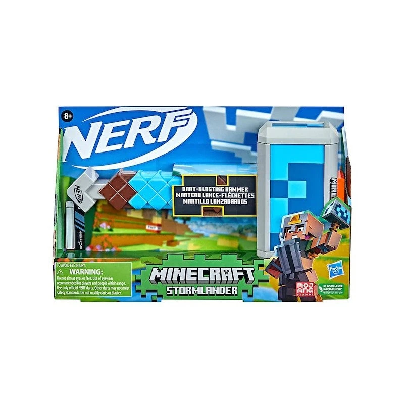 Nerf and Minecraft combine to create distinctive blasters that change the look of battle! The Nerf Minecraft Stormlander hammer takes its inspiration from Minecraft: Dungeons, capturing the look of the hammer from the popular video game.This dart-blasting hammer holds 3 Nerf Elite darts and unleashes them 1 at a time. Load 3 darts in the front of the hammer, pull the priming handle, and press the button to fire 1 dart. The Nerf Minecraft Stormlander hammer includes 3 Official Nerf Elite foam darts that are tested and approved for performance and quality, and are great for indoor and outdoor Nerf battles.