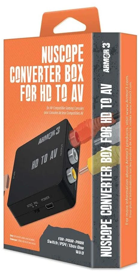 The Armor3 ���NuScope��� Converter Box for HD to AV allows you to play your HD devices on any NTSC/PAL AV display such as your favorite CRT TV or AV-only projector. It is perfect for Switch, PS4, Xbox One, Wii U, and certain Xbox 360 models as well as PC and Mac computers; Chromecast; Fire TV Stick; and other HD devices. The included 2ft. Mini cable allows for easy placement of your HD device around your AV