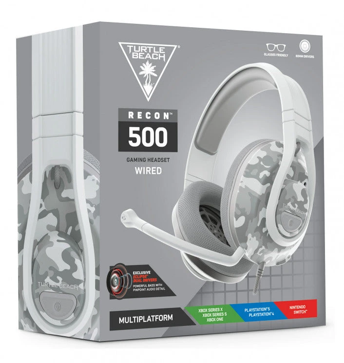 Hear a revolution in gaming audio with the Turtle Beach Recon 500. Featuring first-of-their-kind 60mm Eclipse Dual Drivers delivering stunning sound with dedicated woofers and tweeters, engineered with AccuTune for acoustic perfection. Keep in touch with your teammates (or taunt your enemies) on the removable TruSpeak noise-cancelling mic delivering clear, pro-level comms. Play in comfort even during marathon sessions thanks to breathable memory foam ear cushions and a durable, lightweight, metal-reinforced headband. And its simple wired connection works perfectly on any device using a standard 3.5mm jack, so your Recon 500 is always ready for battle, no”1″>Features: