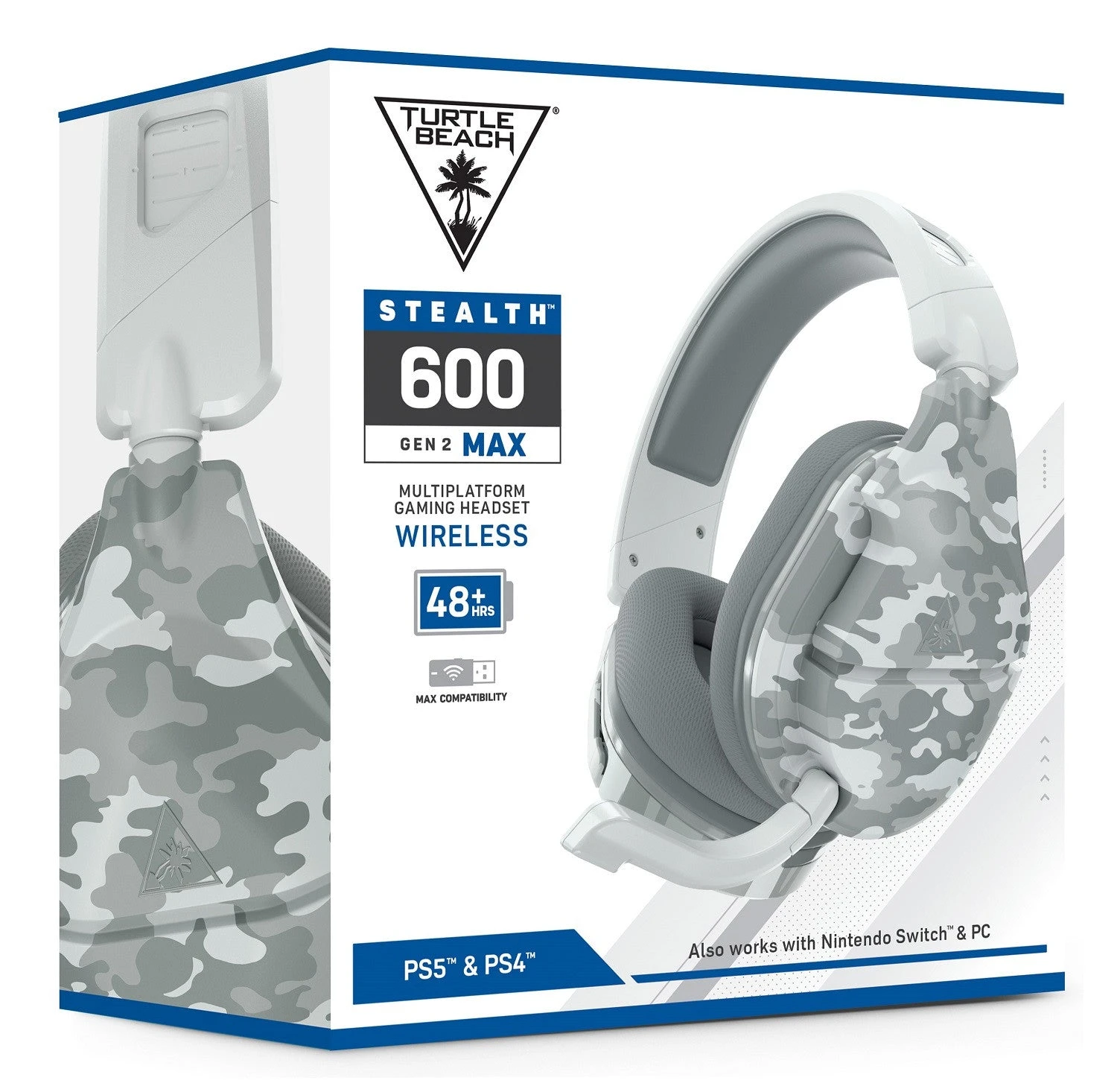 The Turtle Beach® Stealth™ 600 Gen 2 MAX wireless multiplatform gaming headset delivers incredible battery life and high-quality audio & chat for PlayStation® Nintendo Switch™ & PC. A massive 48+ hour battery keeps you in the game for weeks without a charge and low-latency connection is made possible by our proprietary lag-free 2.4GHz wireless. Hear immersive spatial audio through a pair of 50mm speakers and chat clearly with a larger gen 2 flip-to-mute microphone. Soft glasses-friendly ear cushions offer plush comfort and easy access controls let you cycle through audio presets adjust the variable mic monitoring and activate Superhuman Hearing® for a proven audio advantage.