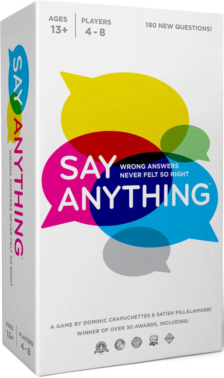 Wrong answers never felt so right! One of histories most award-winning and best selling party games has gotten a makeover – and new questions!Say Anythingprompts you to settle questions that have been hotly debated for years, such asWhats the worst time to bust out laughing?, or Never come home with a bag full of __________. How witty, weird, or wild do you want to be? Do not be shy, this is a brand new chance for you to Say Anything!