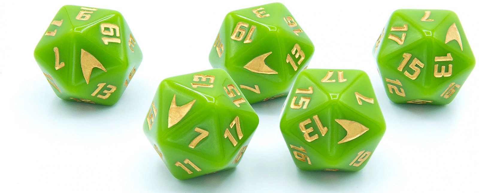 Engage in Star Trek Adventures roleplaying with the official Captain Kirk?s tunic themed roleplaying dice set. Five twenty-sided dice with a custom green and gold captain?s tunic design. Previously only available in the Star Trek Adventures Tricorder Collector?s Box Set.