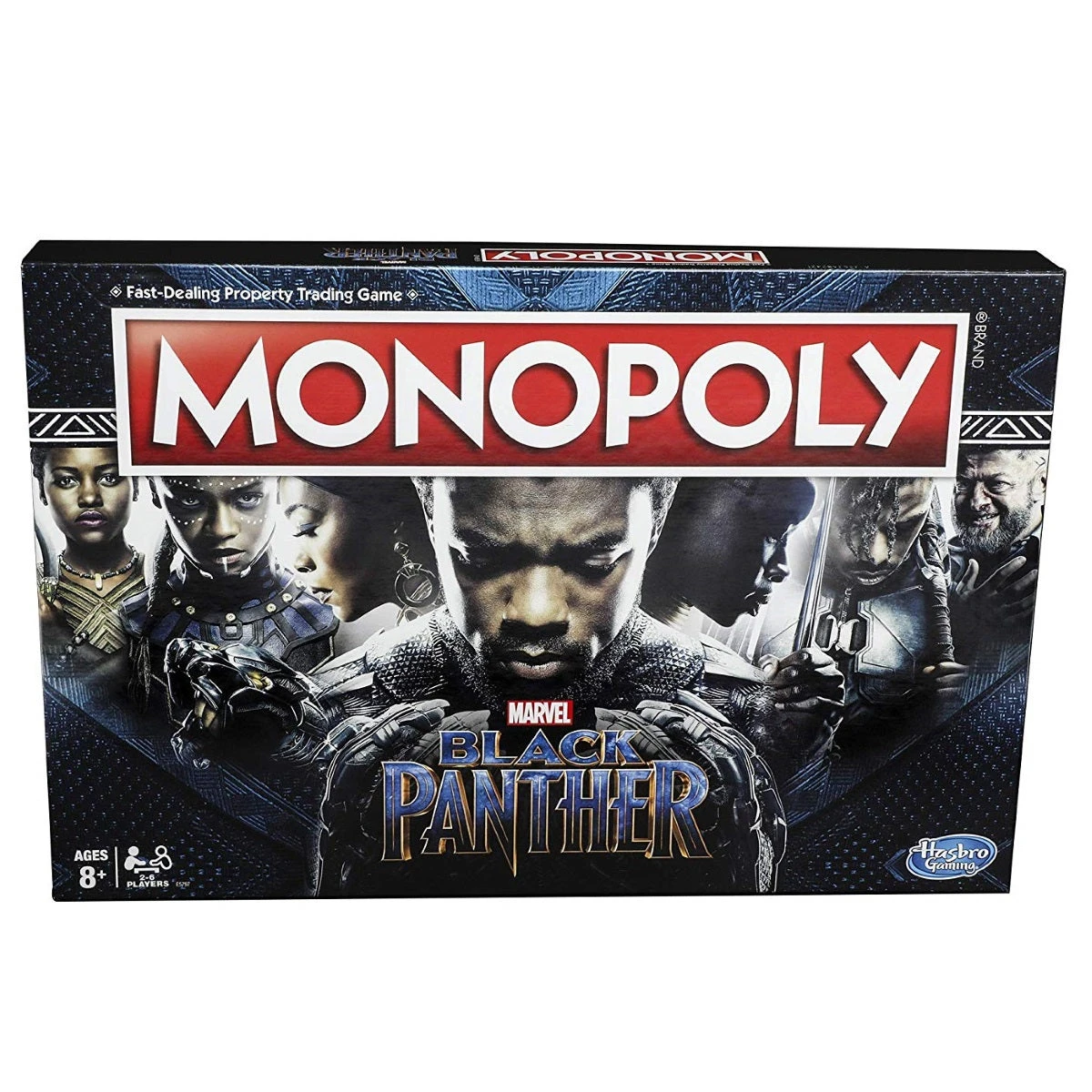 Marvel Black Panther Monopoly Edition Board Game. From the Warrior Falls Challenge Pool, to the Hall of Kings, to the Tribal Council Room in the Golden City, this Edition of the Monopoly game features locations and themes inspired by Marvel’s Black Panther. Players can imagine exploring beautiful Wakanda with T’Challa and his people as they move around the board trying to make as many Alliances as they can. Build Villages and Strongholds, and make moves directed by the Kimoyo Beads cards and Heart-shaped Herb cards!