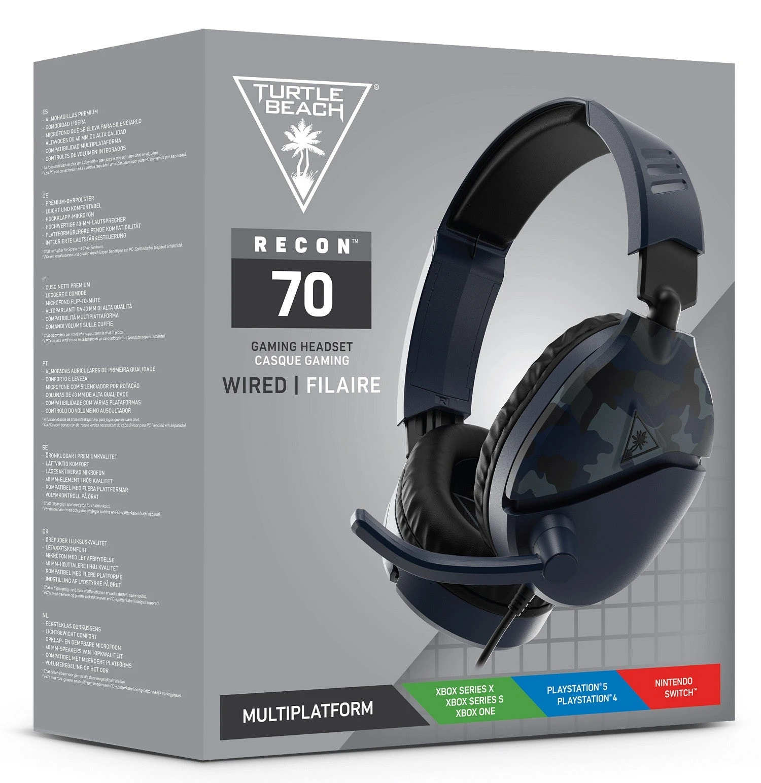 Built for your next victory your latest achievement and much more is the Turtle Beach® Recon 70 Blue Camo multiplatform gaming headset. Featuring Turtle Beach’s latest lightweight and comfortable headset design for hours of play with high-quality 40mm speakers and over-ear premium synthetic leather cushions that let you hear every crisp high and thundering low while blocking noise. Turtle Beach’s renowned high-sensitivity mic to ensure you are heard clearly and easily flips up to mute. Finally the versatile 3.5mm connection makes it perfect for swapping between PS4™ and Xbox One controllers Nintendo Switch™ as well as compatible mobile devices.